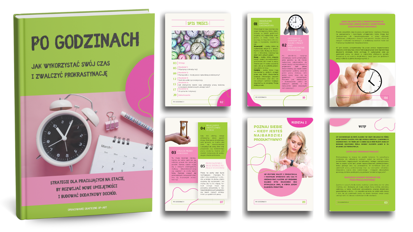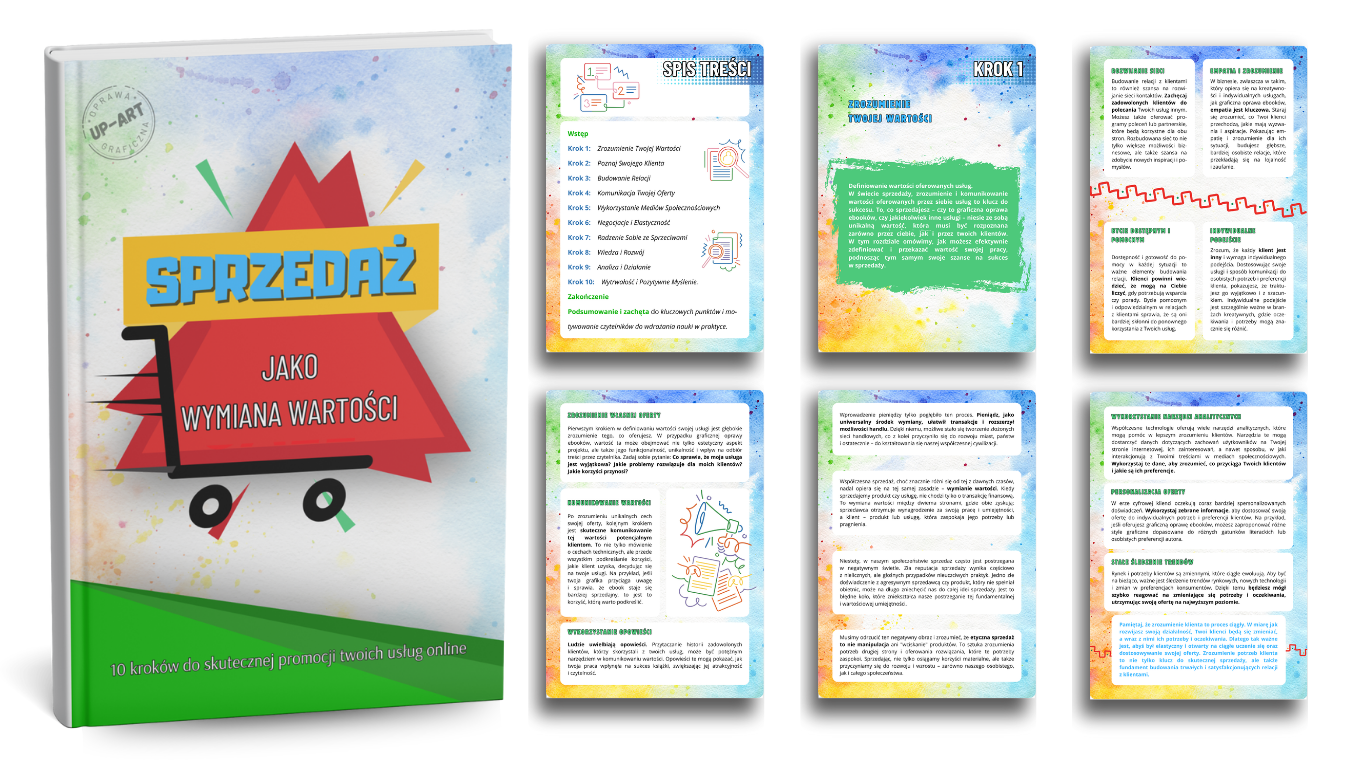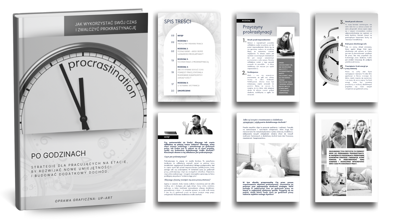 Zyskujesz gotowy e-book w formacie PDF, wybraną okładkę i mockupy do promocji swojego e-booka w mediach. Dodatkowo za twoją zgodą – miejsce w mojej galerii Partnerów z logo firmy.